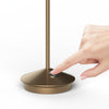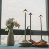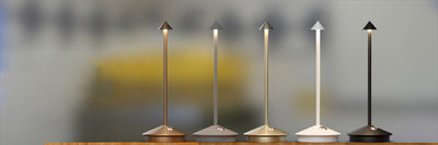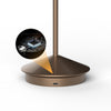 コードレス テーブル ランプは、幅広のベース、スリムなポール、および LED テーパー ランプシェードで構成されています。
